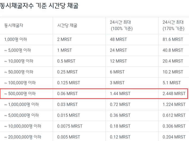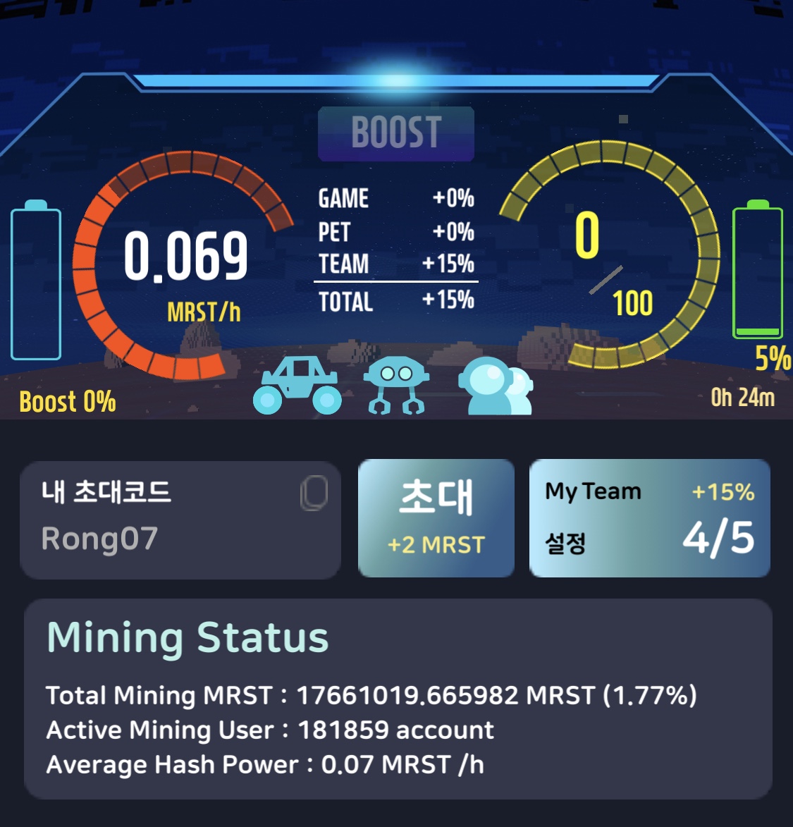현재 단계에서는 시간당 0.06 MRST가 채굴되며 팀구성 15% 보너스를 받게되면 시간당 0.069개가 채굴됩니다.
