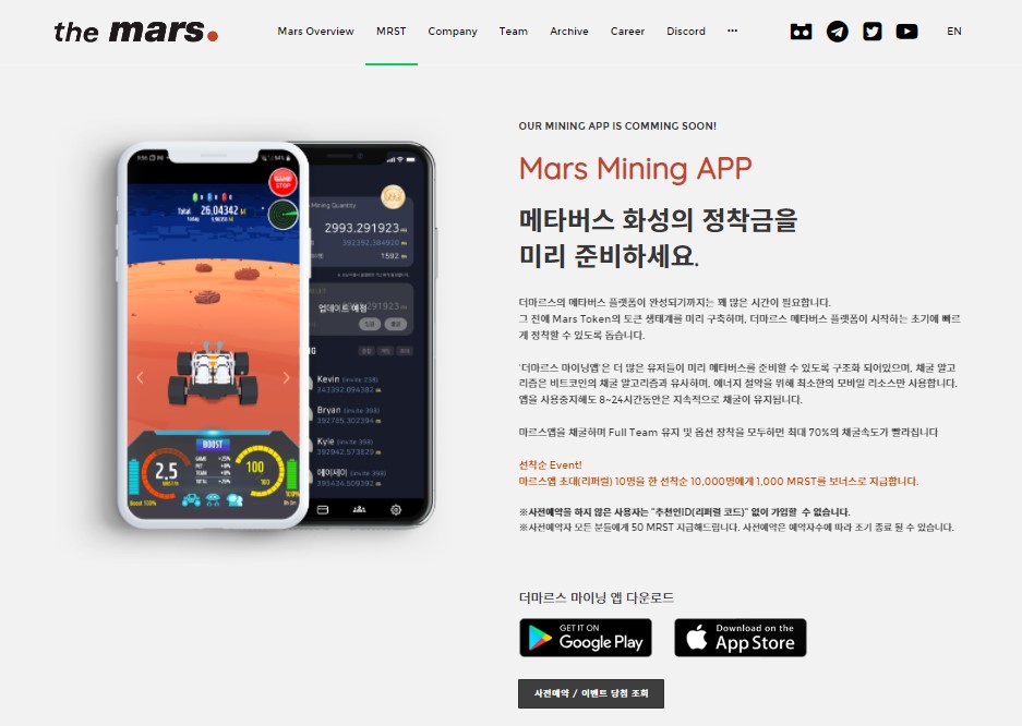 더마르스 마이닝앱은 플랫폼의 토큰인 MRST를 채굴하기 위한 용도로 출시 되었어요, 이것이 무슨말이냐 하면, 더마르스라는 메타버스 플랫폼에서 사용되는 통화가 바로 MRST(Mars Token)이라는 뜻이에요.
